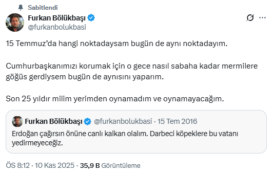 Ardından ise 15 Temmuz 2016’da yaptığı bir paylaşımı alıntıladığı paylaşımı profiline sabitledi. O paylaşımda ise, “15 Temmuz’da hangi noktadaysam bugün de aynı noktadayım. Cumhurbaşkanımızı korumak için o gece nasıl sabaha kadar mermilere göğüs gerdiysem bugün de aynısını yaparım. Son 25 yıldır milim yerimden oynamadım ve oynamayacağım” ifadelerini kullanması dikkat çekti.