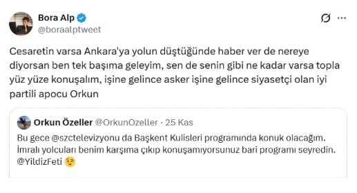 Bora Alp, son dönemde emekli Albay Orkun Özeller’e yönelik mesajıyla da gündeme gelmişti.